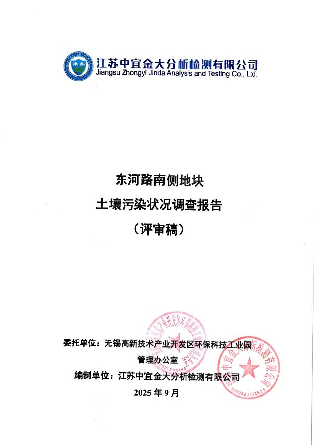 为实现项目用地安全、环保可持续地发展,无锡高新技术产业开发区环保科技工业园管理办公室组织开展东河路南侧地块土壤污染状况调查工作,委托江苏中宜金大分析检测有限公司编制了《东河路南侧地块土壤污染状况调查报告》。